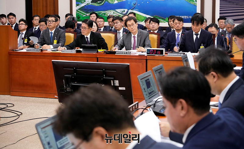 함진규 한국도로공사 사장이 16일 오전 국회에서 열린 국토교통위원회 국정감사에 출석해 의원들의 질의에 답하고 있다.