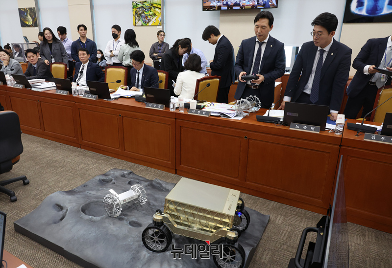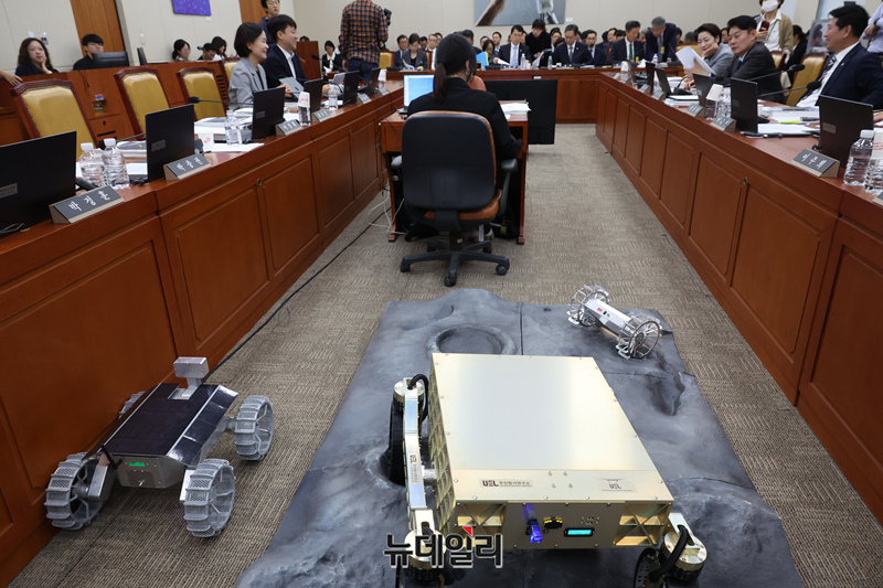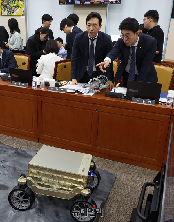 노종면·이정헌 더불어민주당 의원이 16일 국회에서 열린 과학기술정보방송통신위원회의 원자력안전위원회 등 국정감사에서 무인탐사 로봇을 살피고 있다.