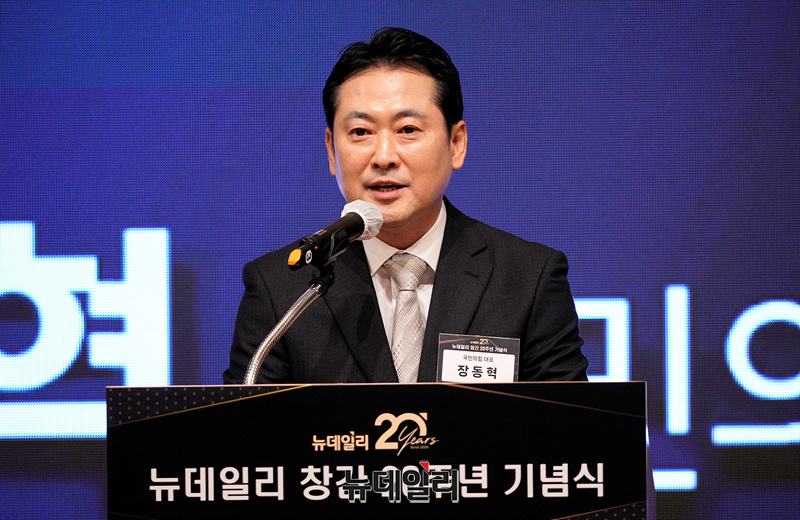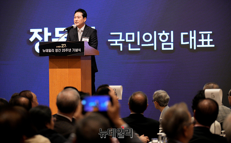 장동혁 국민의힘 대표가 16일 오후 서울 소공동 롯데호텔에서 열린 '뉴데일리 창간 20주년 기념식'에서 축사를 하고 있다.