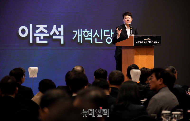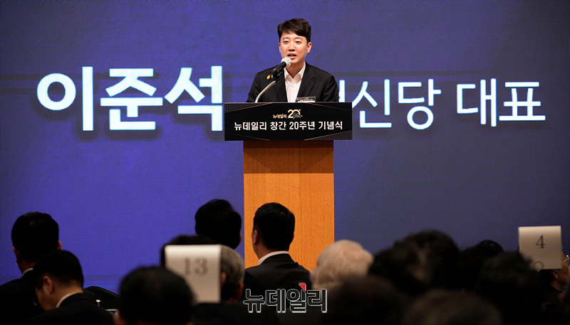 이준석 개혁신당 대표가 16일 오후 서울 소공동 롯데호텔에서 열린 '뉴데일리 창간 20주년 기념식'에서 축사를 하고 있다.