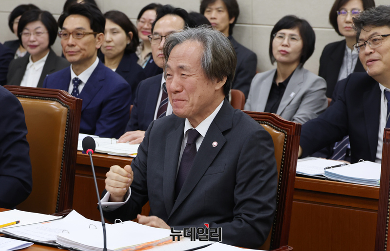정기석 국민건강보험공단 이사장이17일 국회 보건복지위에서 열린 2025년도 건강보험공단과 건강보험 심평원에 대한 국정감사에 출석해 박주민 위원장의 농담에 웃음을 참고 있다.