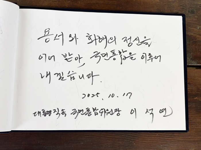 이 위원장은 이날 오후 김대중 대통령 생가에 마련된 영정에 헌화하고 생전의 사진을 둘러보고 난 뒤 "용서와 화해의 정신을 이어 받아 국민통합을 이루어 내겠다"는 글을 방명록에 남겼다. -
