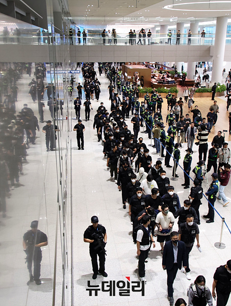 캄보디아에서 보이스피싱등 범죄에 가담했다가 현지 경찰 조사를 받고 이민 당국에 구금됐던 한국인 64명이 18일 오전 인천국제공항 제2여객터미널을 통해 송환되고 있다. (인천=서성진 기자)