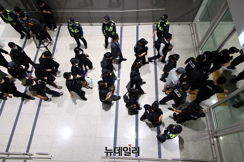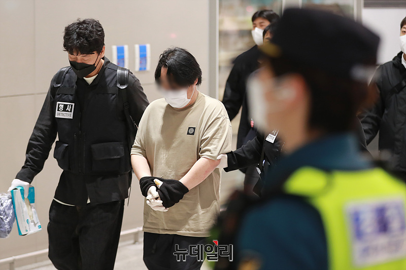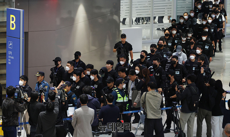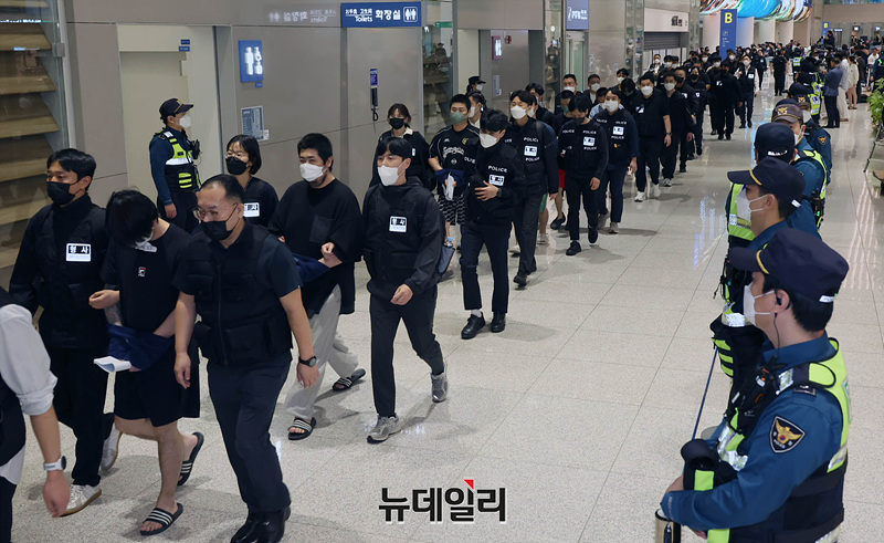 캄보디아에서 보이스피싱등 범죄에 가담했다가 현지 경찰 조사를 받고 이민 당국에 구금됐던 한국인 64명이 18일 오전 인천국제공항 제2여객터미널을 통해 송환되고 있다. (인천=서성진 기자)