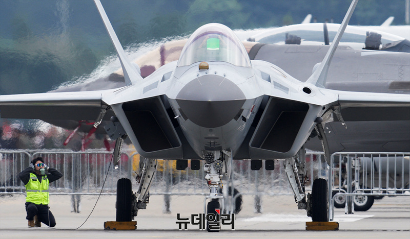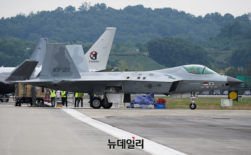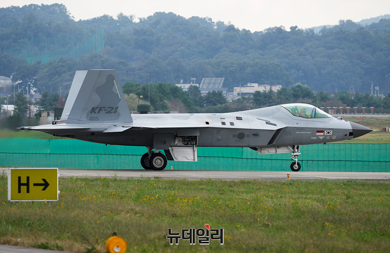 한국형 전투기 보라매(KF-21) 시제기가 18일 오후 서울공항에서 열린 '서울ADEX 2025(서울 국제 항공우주 및 방위산업 전시회)'에서 시범비행을 준비하고 있다. (경기 성남=서성진 기자)