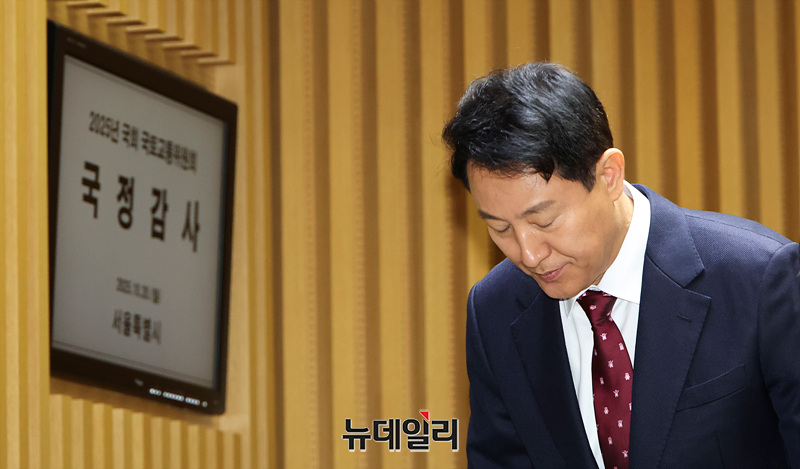 오세훈 서울시장이 20일 오전 서울시청에서 열린 국회 국토교통위원회 국정감사에서 증인선서를 하고 있다.