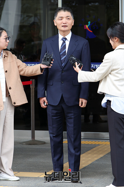 김범수 카카오 경영쇄신위원장이 21일 오전 서울 양천구 서울남부지법에서 열린 SM엔터테인먼트 시세 조종 혐의 1심 공판에서 무죄를 선고받고 법원을 나서며 입장을 밝히고 있다.