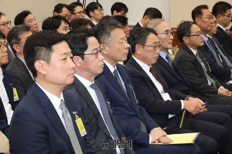 홍범식 LGU+ 대표, 조좌진 롯데카드 대표, 김광일 MBK 대표이사, 유영상 SKT 대표, 김영섭 KT 대표이사가 21일 국회에서 열린 과학기술정보방송통신위원회의 정보통신산업진흥원 등 국정감사에 출석해 질의를 기다리고 있다.