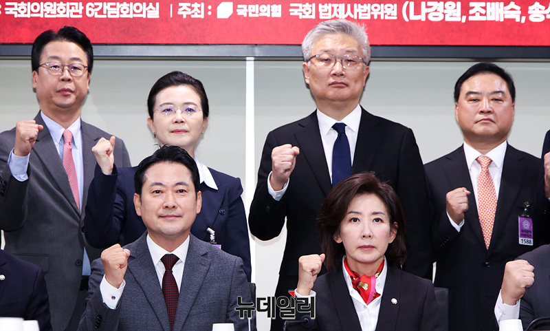 장동혁 국민의힘 대표를 비롯한 의원들이 22일 오전 국회에서 열린 국민의힘 국회 법제사법위원회 주최 '민주당의 입법에 의한 사법침탈 긴급 토론회'에서 기념촬영을 하고 있다.
