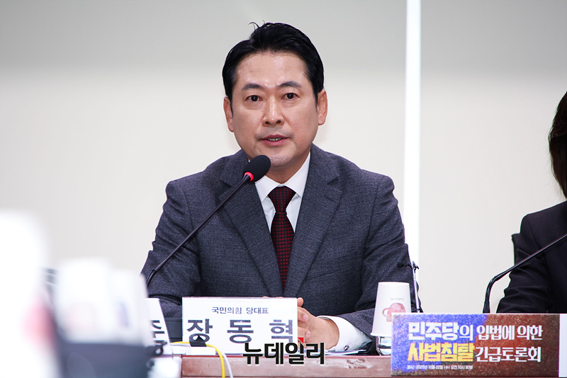 장동혁 국민의힘 대표가이 22일 오전 국회에서 열린 국민의힘 국회 법제사법위원회 주최 '민주당의 입법에 의한 사법침탈 긴급 토론회'에서 인사말을 하고 있다.