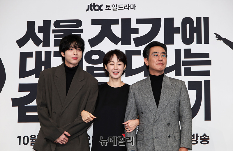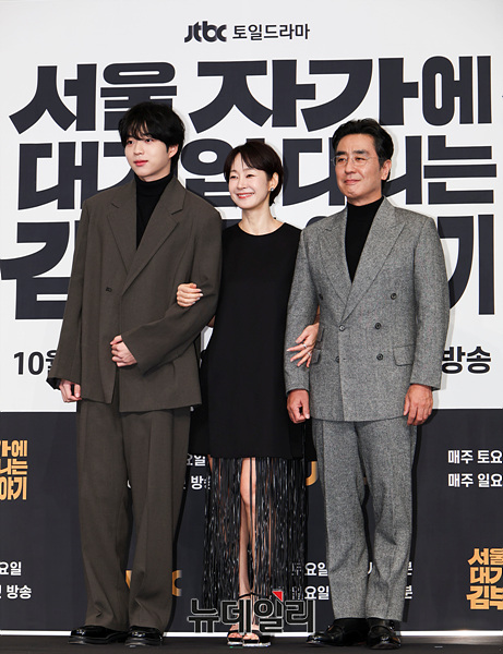 배우 류승룡, 명세빈, 차강윤이 22일 오후 서울 구로구 더링크 호텔에서 열린 JTBC 토일드라마 '서울 자가에 대기업 다니는 김 부장 이야기' 제작발표회에서 포즈를 취하고 있다.