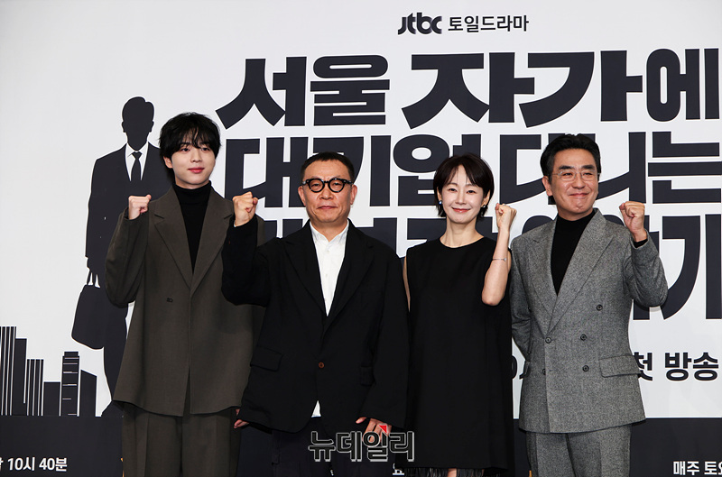배우 차강윤, 명세번, 류승룡, 조현탁 감독이 22일 오후 서울 구로구 더링크 호텔에서 열린 JTBC 토일드라마 '서울 자가에 대기업 다니는 김 부장 이야기' 제작발표회에서 포즈를 취하고 있다.드라마 '서울 자가에 대기업 다니는 김 부장 이야기'는 자신이 가치 있다고 생각한 모든 것을 한순간에 잃어버린 한 중년 남성이 긴 여정 끝에 마침내 대기업 부장이 아닌 진정한 본인의 모습을 발견하게 되는 이야기를 그린다. 25일 오후 10시 40분 첫 방송.