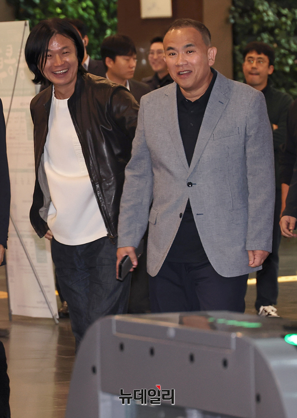 명태균 씨가 23일 오후 서울시청에서 열린 국회 행정안전위원회의 서울시 국정감사에 출석하며 주진우 기자와 대화를 나누며 입장하고 있다.