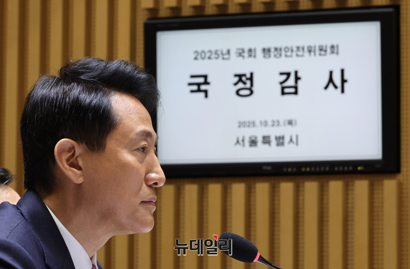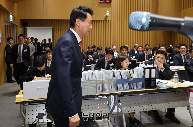 오세훈 서울시장이 23일 오후 서울시청에서 열린 국회 행정안전위원회의 서울시 국정감사에 출석해 자리하고 있다.