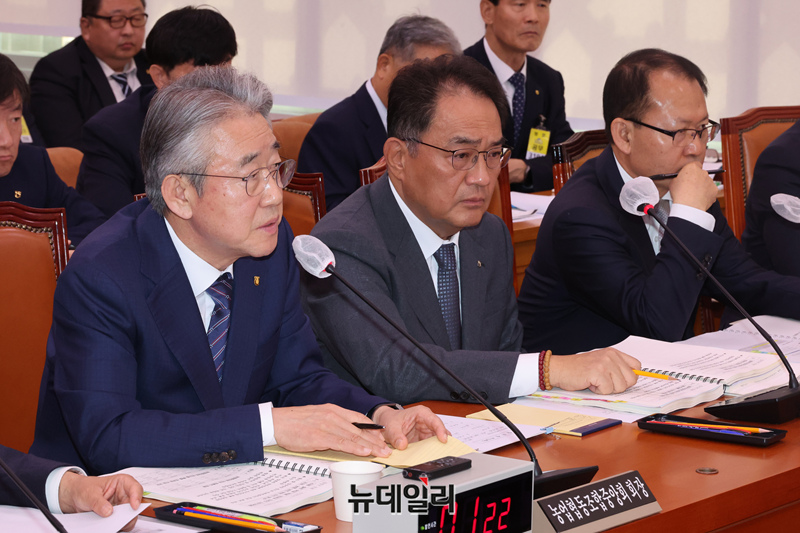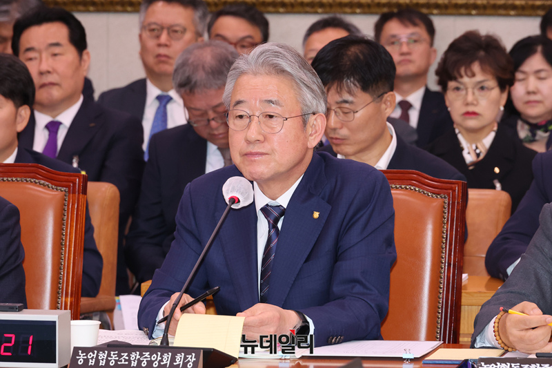 강호동 농협중앙회장이 24일 오전 서울 여의도 국회 농림축산식품해양수산위원회에서 열린 농협중앙회-한국마사회 등에 대한 국정감사에서 의원들의 질문에 답을 하고 있다.