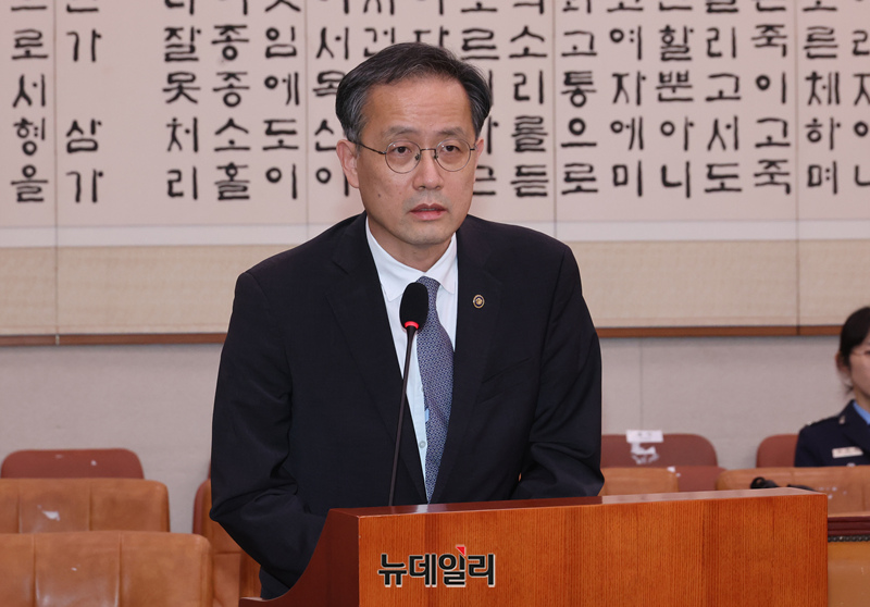 이형일 기획재정부 2차관이 24일 오후 국회 법제사법위원회에서 열린 공수처에 대한 국정감사에 출석해 질의에 답하고 있다.