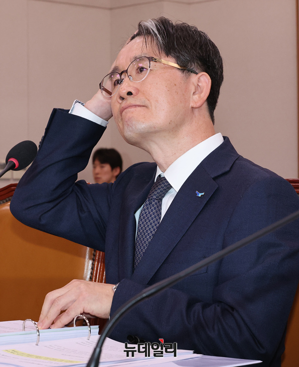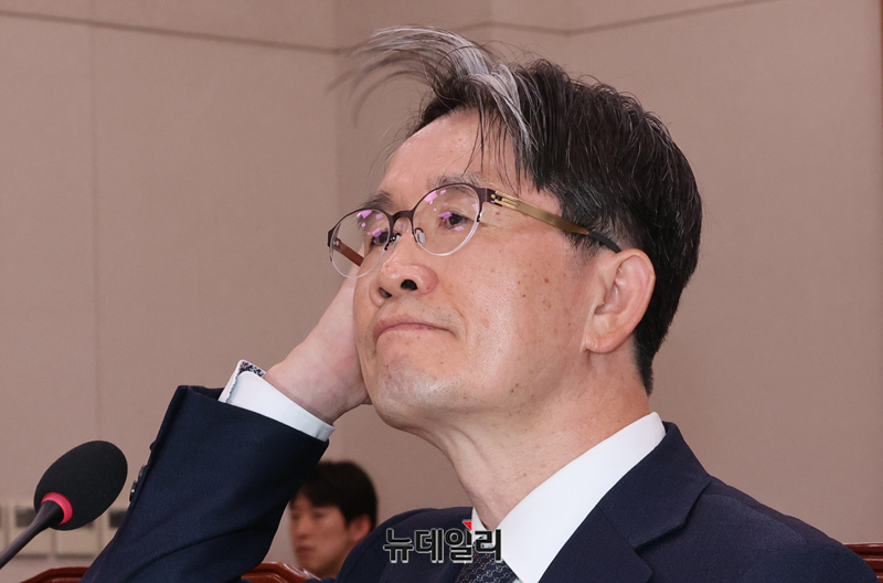 오동훈 고위공직자범죄수사처장이 24일 오후 국회 법제사법위원회에서 열린 공수처에 대한 국정감사에 출석해 머리를 넘기고 있다.