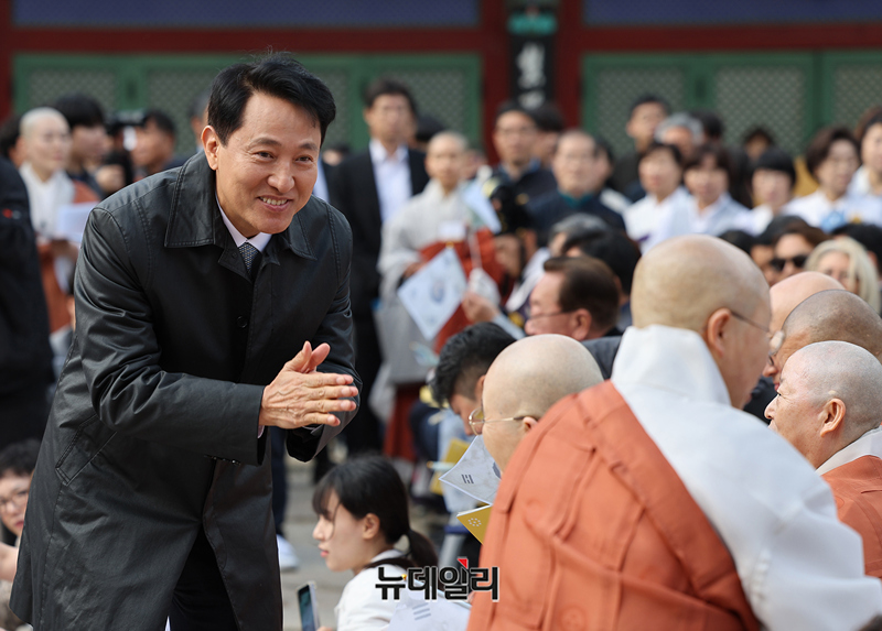 오세훈 서울시장이 25일 서울 은평구 진관사에서 열린 수륙재 개건 627주년 기념 ‘2025년 진관사 수륙재’ 회향식에서 신도들에게 합장하고 있다.