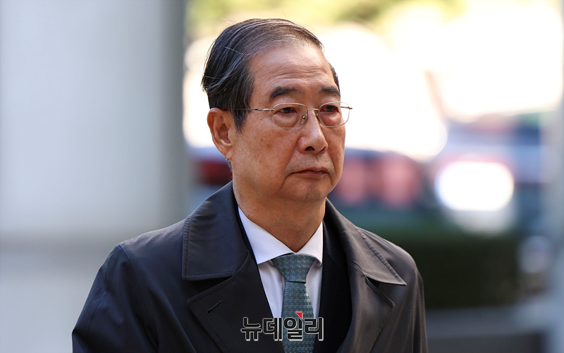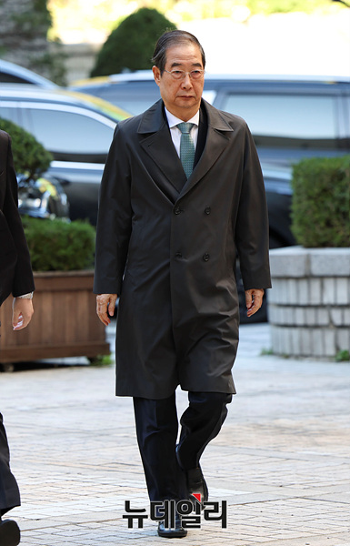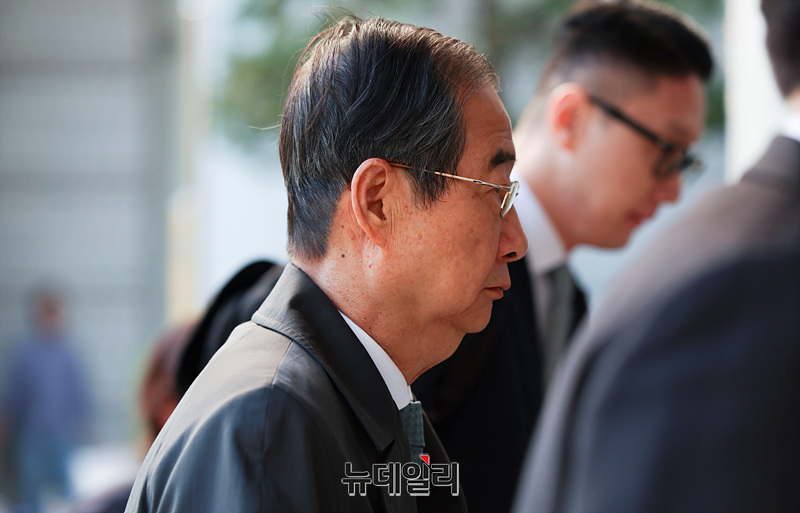 한덕수 전 국무총리가 27일 오전 서울 서초구 서울중앙지법에서 열린 내란 우두머리 방조 혐의 관련 1심 속행 공판에 출석하고 있다.