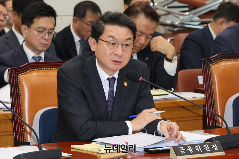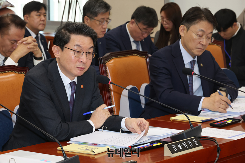 이억원 금융위원회 위원장이 27일 오전 국회 정무위원회에서 열린 국정감사에서 의원들의 질의에 답변하고 있다.