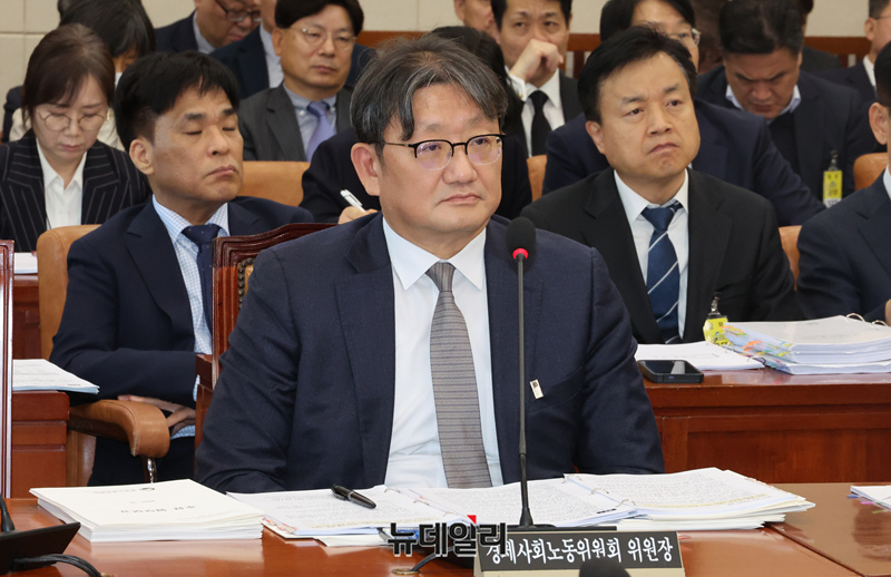 권기섭 경제사회노동위원회 위원장이 27일 오전 국회 기후에너지환경노동위원회에서 열린 경제사회노동위원회 등에 대한 국정감사에 출석해 앉아 있다.