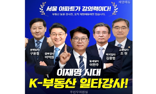 주진우 국민의힘 의원이 촌철살인과 같은 사진 한 장을 만들었다. 부동산 투기 의혹으로 논란이 된 정부와 여당 인사들을 '부동산 일타강사'라고 규정한 것이다.주 의원은 28일 소셜미디어(SNS)에 "부동산 일타강사들로 어떻게 집값을 잡나. '재명에듀' 부동산 일타강사들을 소개한다"며 합성된 사진을 올렸다.해당 이미지에는 이한주 전 더불어민주당 민주연구원장, 김용범 대통령실 정책실장, 구윤철 경제부총리, 이억원 금융위원장, 조현 외교부 장관의 모습이 담겼다.이한주 전 원장에는 ‘절세일타’, 김용범 실장엔 ‘딱지일타’, 구윤철 부총리엔 ‘경매일타’, 이억원 위원장에는 ‘갭투일타’, 조현 장관에는 ‘교환일타’라는 별칭을 붙였다.