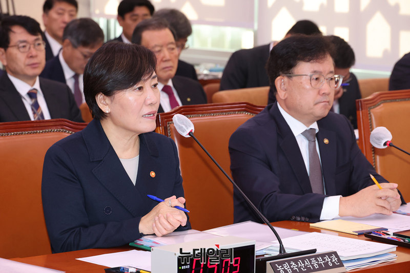 송미령 농림축산식품부 장관이 28일 국회에서 열린 농림축산식품해양수산위원회 국정감사에서 의원들의 질문에 답하고 있다.