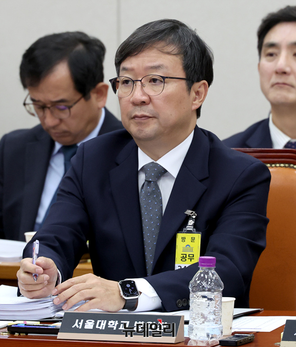 김동환 서울과학기술대학교 총장이 28일 국회 교육위원회에서 열린 서울대학교 등에 대한 국정감사에서 의원들의 질의를 듣고 있다.
