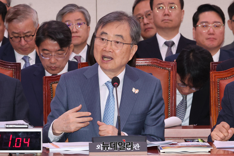 조현 외교부 장관이 28일 오전 국회 외교통일위원회에서 열린 외교부·통일부 등에 대한 국정감사에서 질의에 답하고 있다.