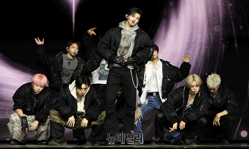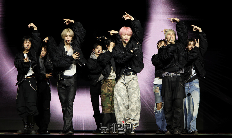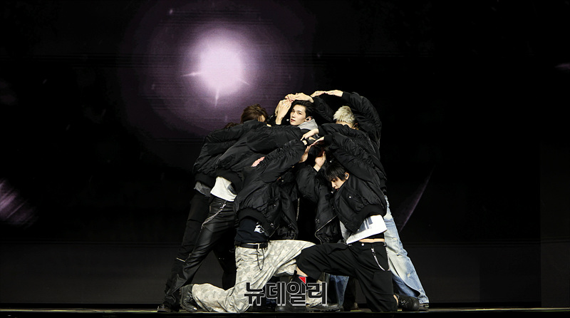 앤팀(&TEAM)이 28일 오후 서울 용산구 블루스퀘어에서 열린 한국 데뷔 미니 1집 '백 투 라이프(Back to Life)' 발매 기념 미디어 쇼케이스에서 무대를 선보이고 있다.
