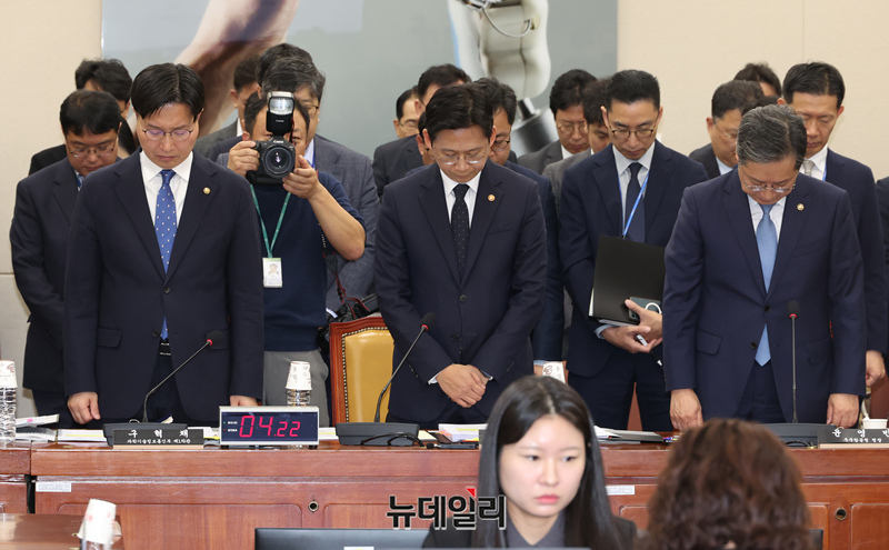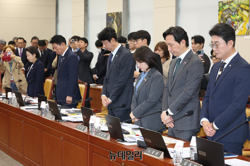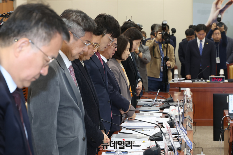 10.29 이태원 참사 3주기인 29일 국회에서 열린 과학기술정보방송통신위원회의 과학기술정보통신부 등에 대한 국정감사에서 참석자들이 추모 묵념을 하고 있다.