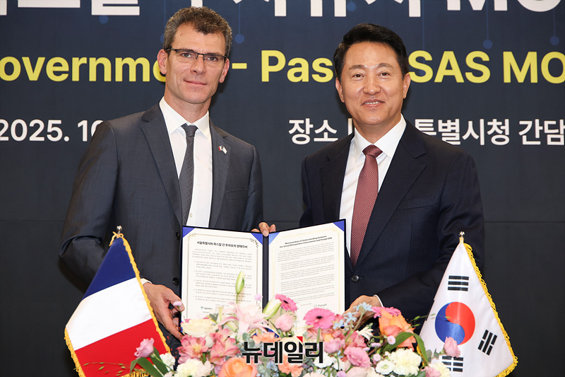 오세훈 서울시장(오른쪽)과 조지 올리비에 레이먼드 파스칼 CSAO를 비롯한 참석자들이 29일 오후 서울시청에서 열린 '서울시-파스칼 투자유치 MOU 체결식'에서 기념촬영을 하고 있다.