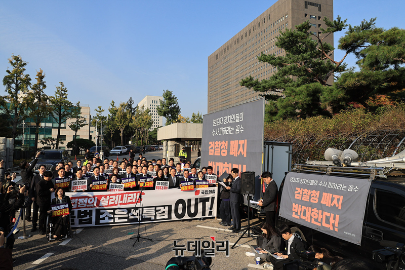 주진우 국민의힘 의원이 30일 오전 서울 서초구 서울중앙지검 앞에서 열린 현장 의원총회에서 조은석 특검을 규탄하고 있다.