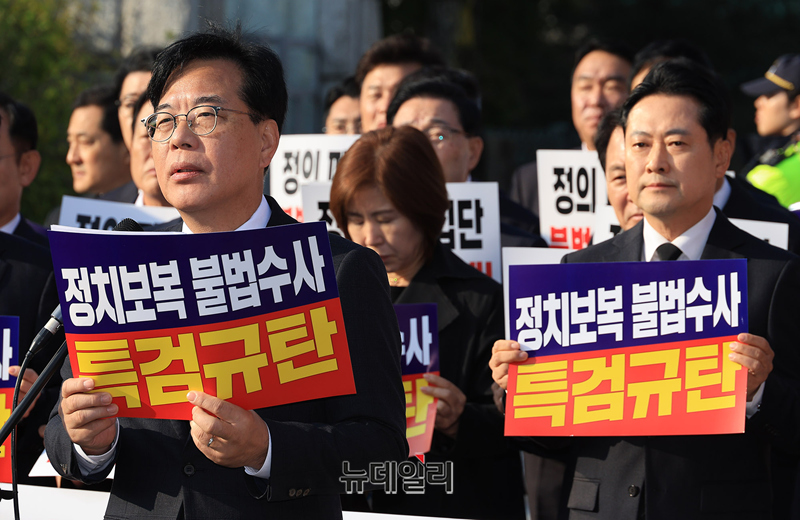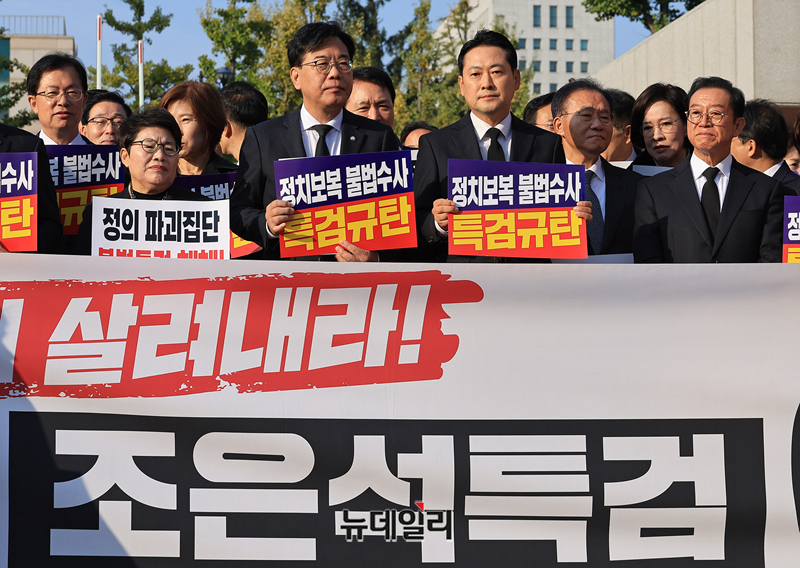 장동혁 국민의힘 대표와 송언석 원내대표가 30일 오전 서울 서초구 서울중앙지검 앞에서 열린 현장 의원총회에서 조은석 특검을 규탄하는 손피켓을 들고 자리하고 있다.