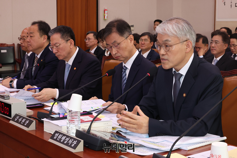 천대엽 법원행정처장이 30일 국회 법제사법위원회에서 열린 종합감사에서 의원들의 질문에 답하고 있다.
