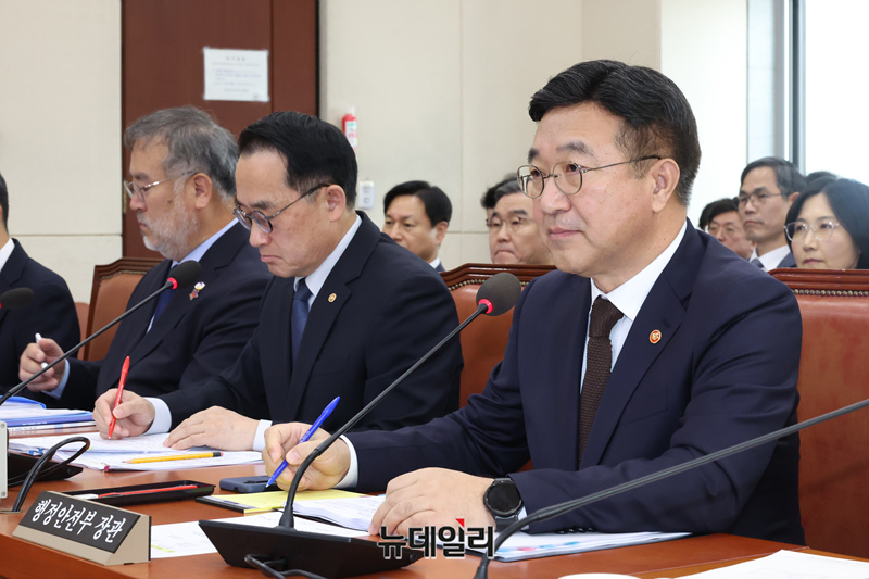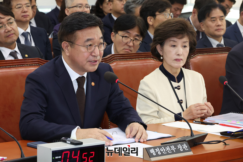 윤호중 행정안전부 장관이 30일 오전 국회 행정안전위원회에서 열린 행안부 등 종합감사에서 의원의 질의에 답변하고 있다.