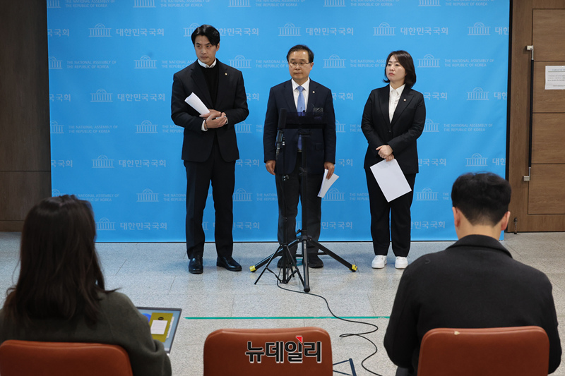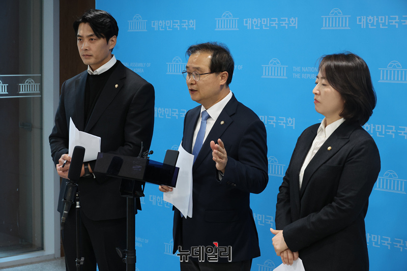 더불어민주당 정치검찰 조작기소대응특위 소속 의원들이 3일 오후 국회 소통관에서 정진상 전 더불어민주당 당 대표실 정무조정실장에 대한 검찰 수사와 관련해 기자회견을 마치고 기자들의 질문에 답하고 있다.