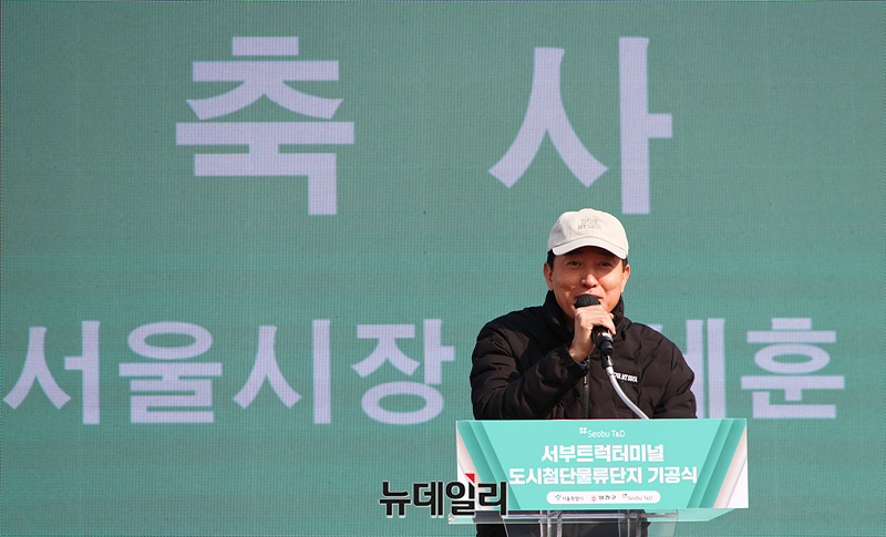 오세훈 서울시장이 4일 오후 서울 양천구 서부트럭터미널 부지에서 열린 도시첨단물류단지 기공식에서 축사를 하고 있다.