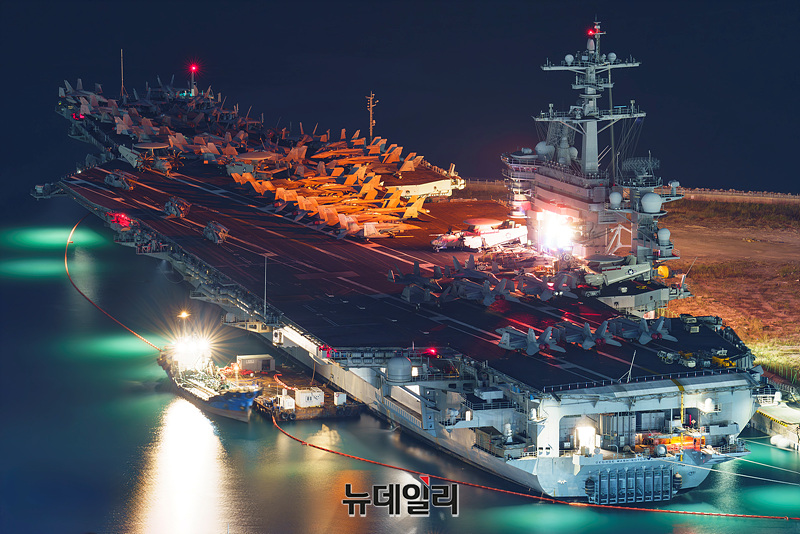 미국 해군 7함대 소속 핵 추진 항공모함 조지워싱턴함이 6일 오후 군수 적재 및 승조원 휴식 등을 위해 부산 남구 해군작전사령부 부산기지에 입항해 있다. (사진=독자제공)