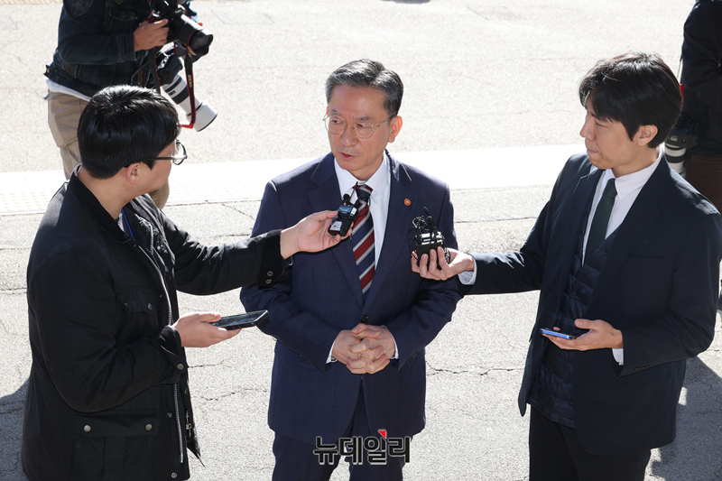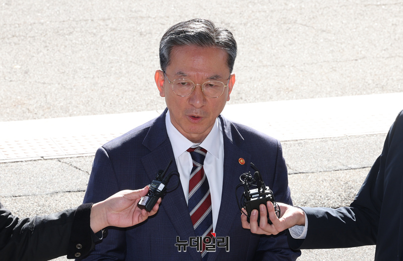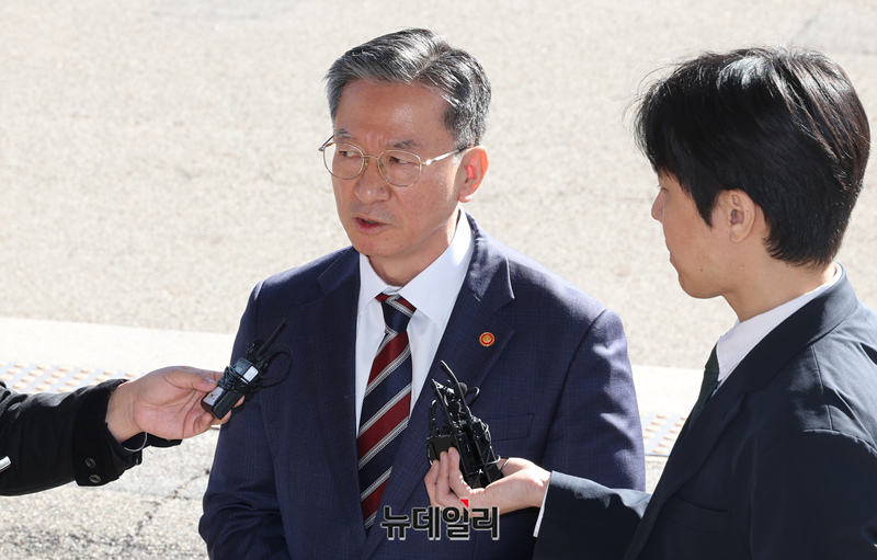 정성호 법무부 장관이 10일 경기 과천시 법무부 청사 출근길에서 검찰의 '대장동 항소 포기' 결정과 관련해 취재진 질문에 답하고 있다.