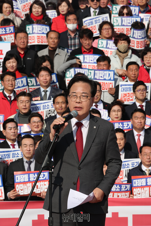 송언석 국민의힘 원내대표가 12일 오전 국회 본청 앞 계단에서 열린 국민의힘 '대장동 일당 7400억 국고 환수 촉구 및 검찰 항소포기 외압 규탄대회'에서 발언을 하고 있다.