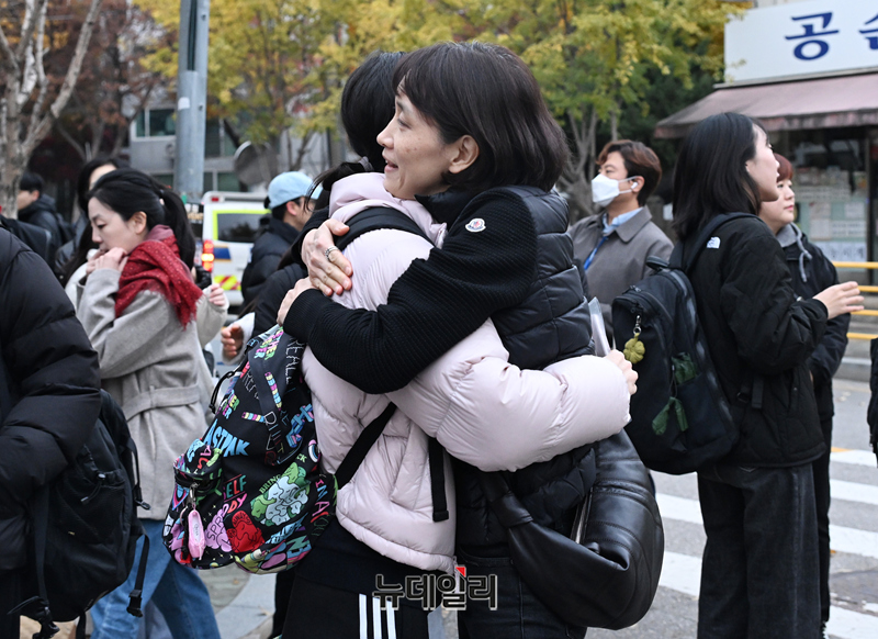 2026학년도 대학수학능력시험일인 13일 오전 서울 광진구 광남고등학교에서 한 수험생이 교문 앞에서 어머니와 포옹하고 있다. (사진=공동취재단)