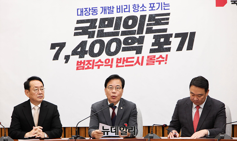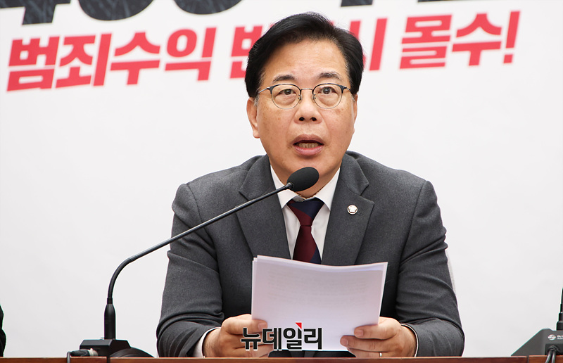 송언석 국민의힘 원내대표가 14일 오전 국회에서 열린 원내대책회의에서 모두발언을 하고 있다.