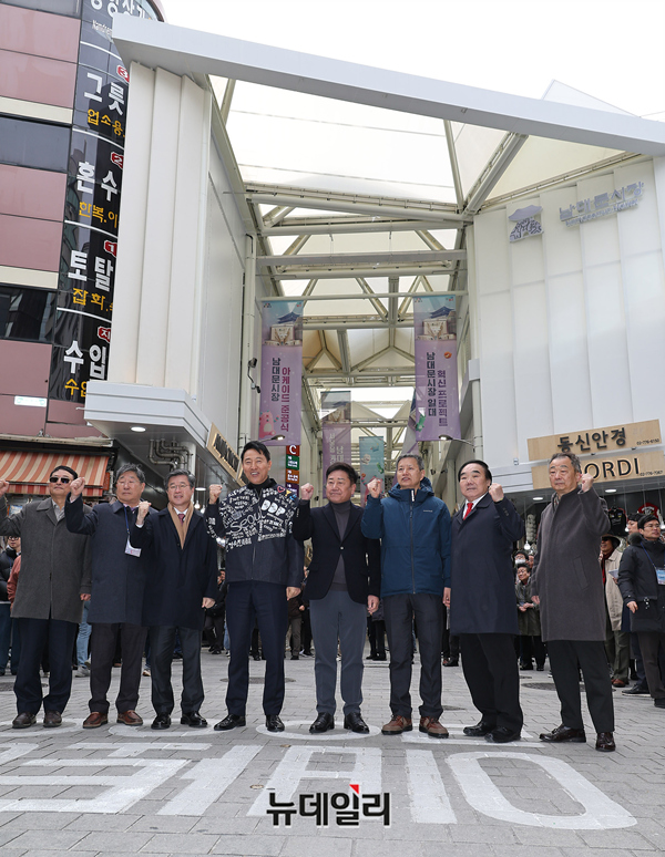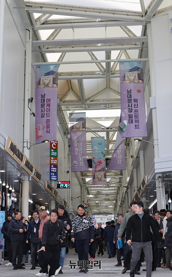 오세훈 서울시장이 17일 오전 서울 중구 남대문시장 아케이드 조성 준공식 행사 직후 관계자들과 시장을 둘러보고 있다.