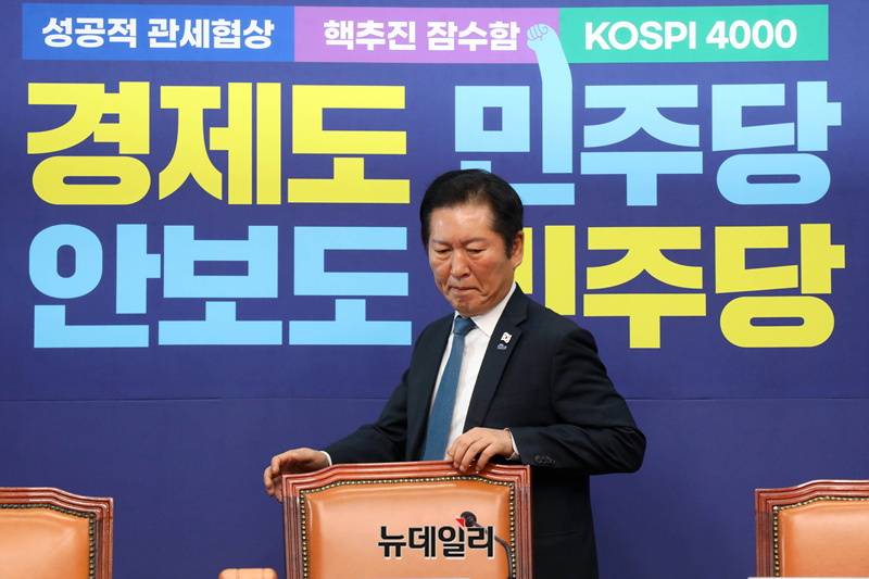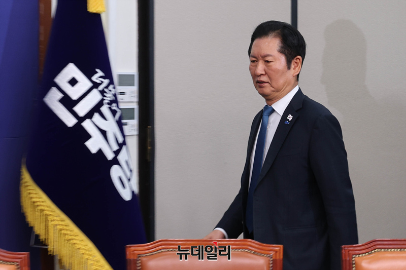 정청래 더불어민주당 대표가 17일 오전 국회에서 열린 최고위원회의에 참석하고 있다.