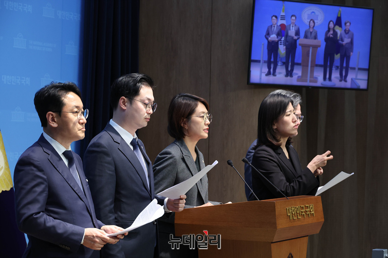 천준호 더불어민주당 오세훈 시정실패 정상화 TF 단장을 및 의원들이 17일 오후 국회 소통관에서 한강버스 멈춤 사고와 관련 기자회견을 하고 있다.