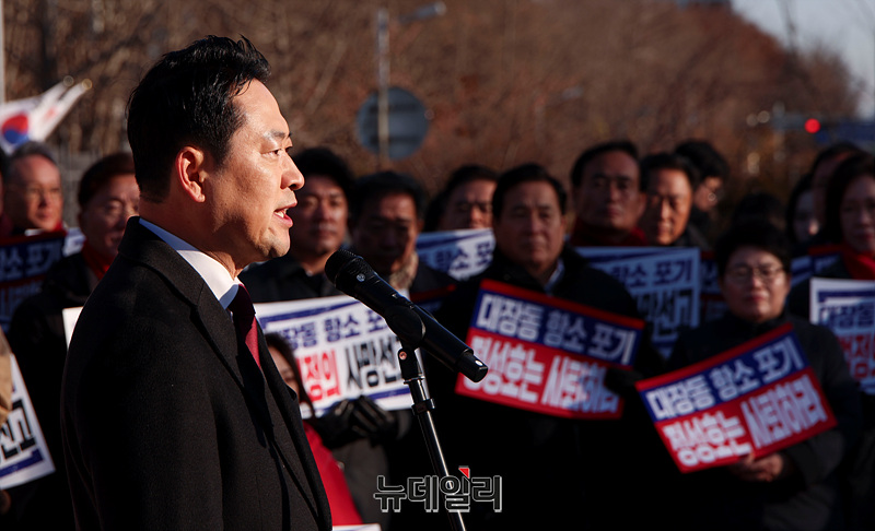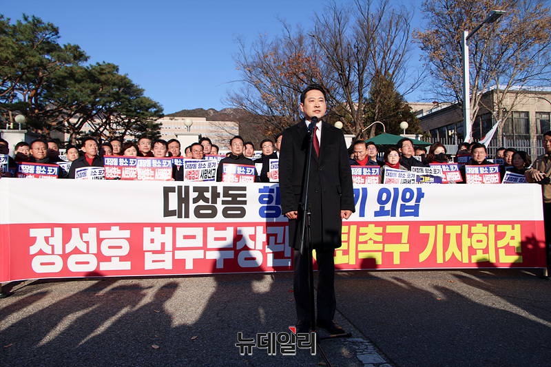 장동혁 국민의힘 대표가 18일 오전 경기 과천시 정부과천청사 앞에서 열린 대장동 항소 포기 외압 정성호 법무부장관 사퇴촉구 기자회견에서 규탄사를 하고 있다.