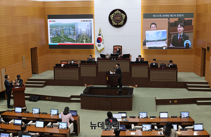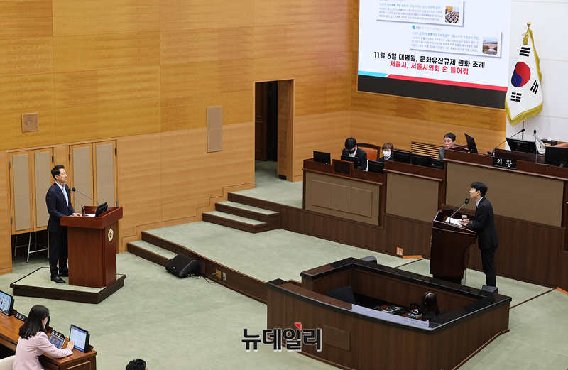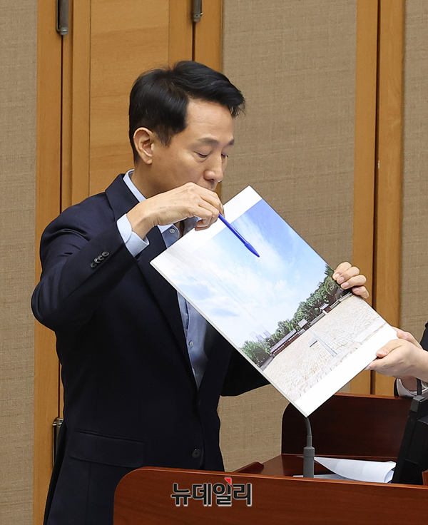 오세훈 서울시장이 18일 오전 서울 중구 서울시의회에서 열린 제2차 본회의에서 김규남 시의원의 서울 종묘 인근 재개발 사업과 관련한 질문에 처음 공개하는 시뮬레이션 결과판을 들고 설명하고 있다.