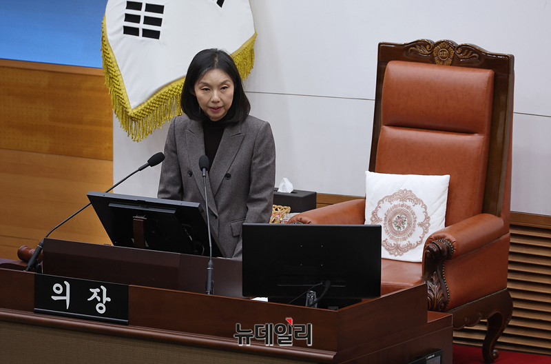 최호정 서울시의회 의장이 18일 오전 서울 중구 서울시의회에서 열린 제2차 본회의에 참석해 자리하고 있다.