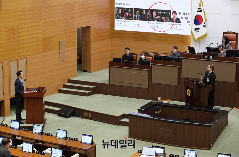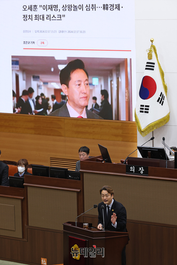 박유진 서울시의원이 18일 오전 서울 중구 서울시의회에서 열린 제2차 본회의에서 오세훈 서울시장에게 시정 질의를 하고 있다.